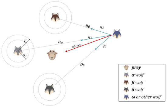 During the hunting stage, gray wolves are assumed to identify the prey’s position (which is set to the α wolf position at the first algorithm loop) and encircle it. However, actually, the desired position of prey is unknown during the whole optimization phase. Usually, it is assumed that the top three rank wolves (e.g., α, β, and δ) have a better knowledge of the prey’s potential location. Therefore, we saved these three solutions so far and asked other gray wolves (including ω) to update their positions with the iteration based on the first three best-searched positions. Here, the following equation is proposed.