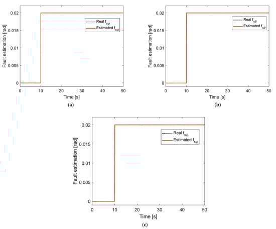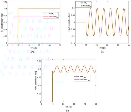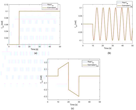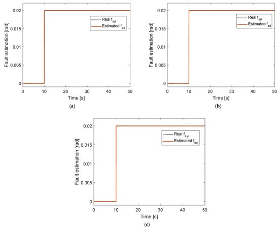Fault estimation under constant fault without disturbance: (a) In roll motion; (b) In pitch motion; (c) in yaw motion.