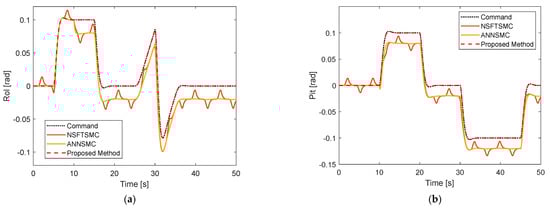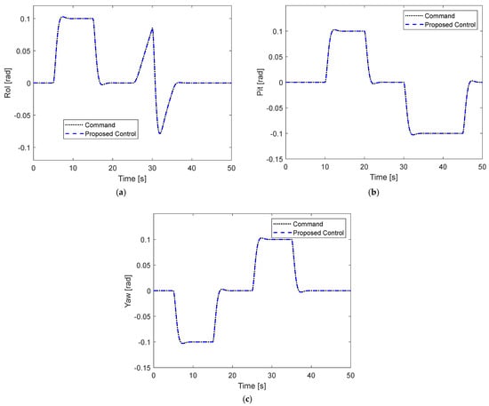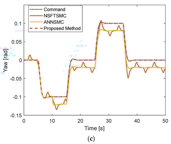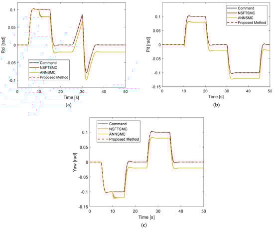 Tracking performance under constant fault without disturbance: (a) Roll motion; (b) Pitch motion; (c) Yaw motion.