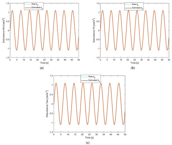 Disturbance estimation under constant fault and time-varying disturbance: (a) In Roll motion; (b) In Pitch motion; (c) In Yaw motion.