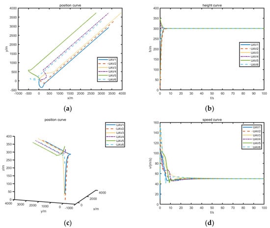 Under the improved control protocol, the position curves, speed curves, course angle curves, and expected formation of the six UAVs are shown in Figure 3.
