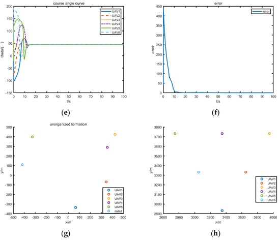 States of UAV formation. (a) Position curves (XOY-plane). (b) Height curves. (c) Position curves. (d) Speed curves. (e) Course angle curves. (f) Error. (g) Unorganized formation (5 s). (h) Final formation.