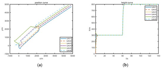 The time delays satisfy . The initial state of the six UAVs and the parameters setting are listed in Table 1 and Table 2.