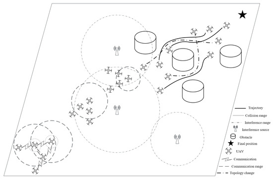 With the rapid development of UAV technology, the multi-UAV network is widely used in civil and military fields such as disaster rescue, air reconnaissance, etc. [1,2,3,4,5]. The communication topology of the multi-UAV network affects its work efficiency, and its connectivity can be maintained by controlling the topology of the multi-UAV formation. Therefore, it is fundamental to carry out research on the formation topology control of multi-UAVs. During the actual flight, the limited communication range of UAVs and different environmental factors, such as obstacles and interference sources, will affect the connectivity of the multi-UAV network. Thus, it is necessary to maintain connectivity of the entire multi-UAV network by controlling multi-UAV formations in complex environments [6].
