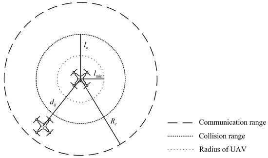 Figure 4 shows the collision zone and communication interaction zone around the UAV, where is the maximum transmission distance of signals between UAVs, is the maximum range of influence of obstacles on the UAV, and is the radius of the UAV. In order to maintain system connectivity, the distance between two adjacent UAVs in the undirected path cannot be greater than the maximum transmission distance . In this paper, the effects of interference sources and obstacles on the connectivity of multi-UAV networks are considered.