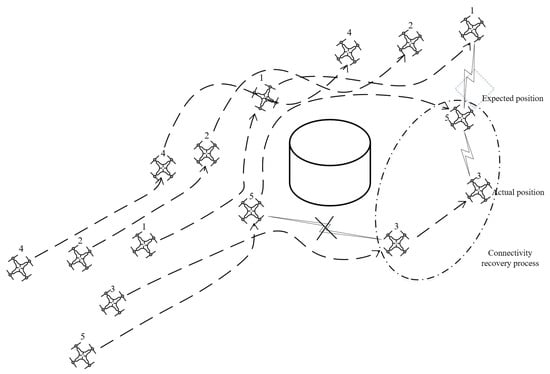 When a UAV is damaged or forced to leave the system, the child UAV of the problem UAV is used as the repair UAV. The multi-UAV formation is traversed down along the communication link until the entire UAV formation is traversed. Then, the repair subnet is established. If there are multiple child UAVs, the child UAV that can reach the expected position of the problem UAV the fastest is judged as the repair UAV according to the position, speed, and acceleration of each child UAV at the current moment. If there are multiple problematic UAVs, select the child UAV of the problematic UAV with a larger weight to repair the missing position. The repair UAV first flies to the desired position of the problem UAV, so as to establish connectivity with other child UAVs of the original problem UAV. The repair UAV is within the maximum communication link range with the root UAV of the problem UAV and approaches the movement direction of the problem UAV when it leaves the team. It then restores the connection with the problem UAV as much as possible. If the connection with the problem UAV cannot be restored, the sub-UAV of the repair also approaches the problem UAV to form a serial link to expand the communication range.