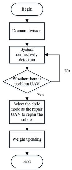 After the repair subnetwork is established, the weights of the sub-UAVs of the problem UAVs are updated. First, each UAV recalculates the current weights according to the formation in the repair subnetwork. It then sends the new weights to the UAVs through the link. Human–machine and the repair UAV sums the new weight and its own weight to realize the weight update.