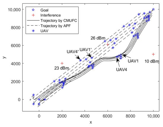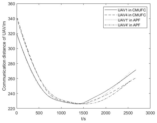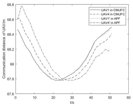 We simulate the performance of the CMUFC algorithm in different scenarios and compare it with the traditional formation control algorithm by APF. The scenario where there are interference sources is shown in Figure 8, and the powers of these three interference sources are 23 dBm, 26 dBm, and 10 dBm, respectively. The CMUFC algorithm helps UAVs to fly to areas with less interference, thereby maintaining the connectivity of the multi-UAV network. Figure 9 shows the communication range of UAVs. When the multi-UAV network is closer to the interference source, the communication range is smaller. Among them, UAV1 and UAV4 are the UAV communication ranges calculated by our proposed algorithm, and UAV and UAV are the communication ranges calculated by the traditional formation control algorithm. Figure 10 shows the distance between two UAVs. The proposed algorithm can help the multi-UAV network adaptively reduce the formation distance to maintain the connectivity of the entire network when the communication range decreases. In addition, as shown in Figure 10, the farthest distance between two UAVs in the multi-UAV network, UAV1 and UAV4, satisfies the communication requirements of UAVs shown in Figure 9. However, the traditional formation control algorithm makes the distance between UAVs far greater than its communication distance, resulting in the inability of the multi-UAV network to maintain connectivity.