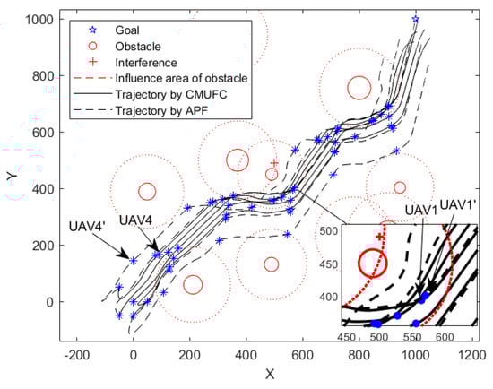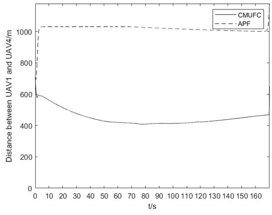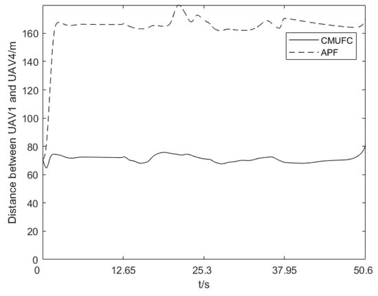 Furthermore, we simulate a complex environment with obstacles and interference sources as shown in Figure 11, where the power of the interference source is 36 dBm, and the radius of the obstacle is 30–50 m. The CMUFC algorithm helps the multi-UAV network fly away from the interference source to maintain connectivity. Due to the existence of interference, the communication distance between UAVs is reduced, making it easier for UAVs to collide with obstacles. Compared with the traditional formation control algorithm, our algorithm keeps the multi-UAV network away from obstacles and improves safety. The distance between UAV1 and UAV4 when flying in a complex environment is shown in Figure 12. The CMUFC algorithm helps UAVs shorten the distance between them without colliding with each other to maintain the connectivity of the entire system when UAVs are interfered. Figure 13 shows the communication distance of UAVs in complex environments. Compared with the traditional formation control algorithm, the CMUCF algorithm controls the flight distance between the UAVs to be less than its communication distance in their entire flight.