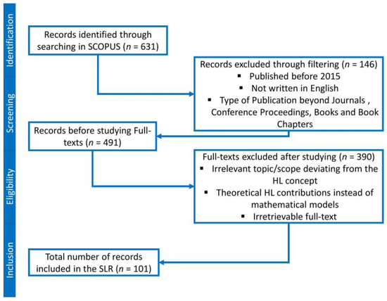 After rigorously examining their content, i.e., their abstract, keywords, table of contents, and main body, we also rejected 390 irrelevant papers (e.g., the majority of rejected papers deviated from the HL concept and focused on other drone applications or were describing theoretical HL contributions instead of mathematical models) as well as papers whose full text could not be retrieved. Considering all of the above, the initial sample size decreased to 101 papers. The systematic screening process described is presented in Figure 1.