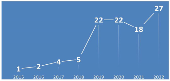 The chronologically first paper selected to be included in this research was [51], published in the International Conference on Informatics in Control, Automation and Robotics (ICINCO). Figure 2 illustrates the number of publications from 2015 to the present moment. From the beginning of our time frame to 2018, the number of papers published has gradually increased, while the rate of growth from 2018 to 2019 has been more than 400%. Despite this emerging trend, after 2019, the overall trend decreased for the next two years. This could be attributed to the COVID-19 pandemic as non-COVID-19 research production decreased. In fact, according to the authors of [52], non-COVID-19-related articles began to decrease in volume as COVID-19-related articles increased. Nevertheless, the trend seems to have surged again in 2022, and it will likely continue to grow in the near future as well.