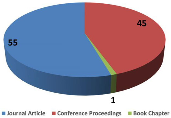 The following pie chart (Figure 3) illustrates that roughly half of the papers in our sample (n = 55, 54.46%) are journal papers, while the remaining papers (n = 45, 44.55%), apart from one book chapter, are conference proceedings. The predominance of journal papers indicates early signs of the maturing of the field.
