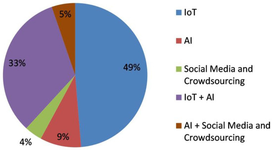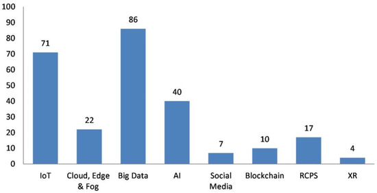 The second criterion pertains to the various DTs complementing drones in the humanitarian operations addressed by the mathematical models in our sample. These DTs include the IoT; cloud, edge, and fog computing; big data analytics; AI; social media and crowdsourcing; RCPSs; blockchain technology; and XR, which are detailed below.