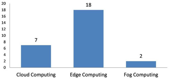 Cloud, edge, and fog computing have been broadly used in IoT data management to increase data processing speed and efficiency as well as to smartify storage, control, and networking and obtain improved resource utilization and availability among connected IoT entities [63]. Cloud computing is the standard IoT computing paradigm that, instead of saving information to local servers or devices, is based on the centralization of resources. This means that all information is kept in multiple remote servers able to be accessed online from any device, which, however, increases latency, bandwidth cost, and network requirements. A new trend in computing is currently emerging with the function of clouds increasingly moving toward network edges [64]. Unlike cloud computing, in edge computing, data are directly processed and kept on edge devices without being transferred to remote servers, which prevents the transmission of irrelevant data to the cloud, eliminates the need to wait for data to return from a centralized processing system, and secures an immediate response and the lowest latency possible. Fog computing works as an intermediate layer between cloud and edge computing and works by taking on specific processing tasks from the two, hence decreasing their workload. Even though it is decentralized like edge computing, unlike it, fog computing takes place further away from the data-generating devices. In fog computing, data are analyzed within an IoT gateway, while in edge computing, data are analyzed on the devices themselves.