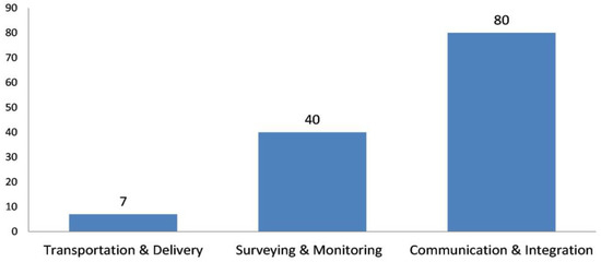 The third criterion was related to the HDOs performed in the studies included in our sample and the HDCs utilized during their execution. The operations we explored are inspired by the context of civil drone applications [43,48] but are here discussed across the humanitarian spectrum. It is worth mentioning that overlapping may exist between the HDOs. HDCs were first investigated in [10] and included the transportation and delivery, surveying and monitoring, and communication and integration capabilities. Briefly, transportation and delivery capabilities aim, among others, at facilitating the delivery of essentials, reducing delivery times, and enabling access to geographically, environmentally or/and, infrastructure-challenged areas, which may be unreachable by conventional transportation means [79,80,81]. Surveying and monitoring capabilities enable remote sensing and the collection of spatial information through the acquisition of high-resolution material even in the harsh environmental conditions of dangerous or impassable disaster-stricken areas as well as of damaged infrastructure in the aftermath of a disaster [82,83,84]. Last, communication and integration capabilities complement terrestrial communication and connectivity and facilitate communication between first responders and victims by providing long-range wireless connectivity for DM tasks [26,85,86]. For further details about HDCs, the reader is referred to Rejeb et al. [5]. As thoroughly analyzed in Section 5, an HDO can utilize one, two, or all three HDCs depending on the setting and objectives. Nonetheless, some HDOs are intrinsically associated with certain HDCs.