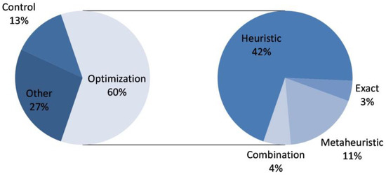 Three exclusion criteria were then set to narrow down the development trends in mathematical models exploiting both UAVs and other DTs in the context of HL. First and foremost, our sample was limited to studies published after 2015. The reason behind this decision was twofold. On the one hand, we wanted to make sure the resulting sample was manageable enough to be carefully studied and analyzed in its entirety. The average SLR sample in the HL literature (bibliometric systematic reviews aside) was ~86 papers (see Table A1 in Appendix A), which is considerably smaller than our initial sample. On the other hand, the scope of this SLR was to collect information about the most novel solutions in the sense that novelty is inherently linked to the most recent years of technological innovation. According to the works presented in [37], the period following 2015 was the most suitable starting point for our research design including DTs and HL due to the recent increase in pertinent scientific interest, resulting in the concepts’ relative maturity [6,36]. This is also corroborated by the authors of [46], who confirmed the infancy of the use of technology and sophisticated mathematical models in HL back in 2015. Taking both points into consideration, 81 papers, which were published before 2015, were rejected. The second criterion set was the exclusion of papers written in any language other than English. Sixteen of the papers yielded by the search were written in Chinese, Korean, or Ukrainian and were therefore removed from the sample. The third and last criterion applied to the type of publications and led to the exclusion of 49 magazines, conference reviews, and errata.