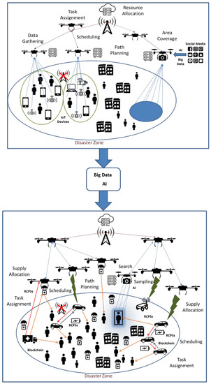 Even though it is not possible to completely prevent all disasters, it is widely known that leveraging emerging digital technologies (DTs) can transform HL operations deployed before, during, and after the strike of a disaster. Recently, unmanned aerial vehicles (UAVs) or “drones” have significantly changed the humanitarian landscape through their communication, monitoring, and transportation capabilities [5]. Other disruptive DTs, such as, but not limited to, big data analytics [6,7,8,9,10,11]; Internet of things (IoT) [12,13,14]; cloud, edge, and fog computing [15,16,17]; artificial intelligence (AI) [18,19,20]; social media and crowdsourcing [8,21,22,23,24]; robotics and cyber-physical systems (RCPSs) [25,26,27]; blockchain [18,28,29,30]; and extended reality (XR) [31,32], have also been harnessed in HL operations. However, the academic literature, to the best of our knowledge, has only focused on drones and DTs as standalone solutions, and the interoperability of drones with other DTs has so far been studied in neither the HL nor DT literature.