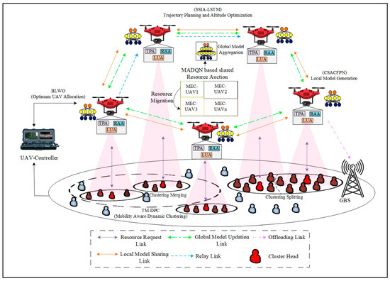 High energy consumption, lack of connectivity, and poor resource allocation are the major problems faced by UAV-enabled wireless networks. The proposed architecture comprises MUs, MEC–UAVs, GBS, and a UAV controller, in which the MEC–UAVs use three learning agents named TPA, LUA, and RAA to enhance resource allocation. At the initial stage, the UAV controller optimally allocates the MEC–UAVs based on the density of MUs using the BLWO algorithm. Second, the MU’s constraints, such as energy consumption and dynamicity, are ensured by clustering using the TM-DPC algorithm based on the mobility of MUs. The CHs are selected based on the mobility and stability of the MUs. Furthermore, the clusters are managed optimally by cluster formation and splitting. At the same time, the MEC–UAV altitude, trajectory, and hover time are optimized jointly using the SSIA-LSTM algorithm. Finally, the bandwidth resources of MEC–UAVs are split into two levels, namely familiar and non-familiar, MTNP-SVM is applied to categorize MU tasks as familiar or non-familiar resources. The dynamic cooperative resource allocation is made by the MEC–UAVs for MUs using an AFL-based CSACFPN (for local model generation) and EDQN (for shared global model generation). The simulation results show that the proposed work outperforms the existing approaches.