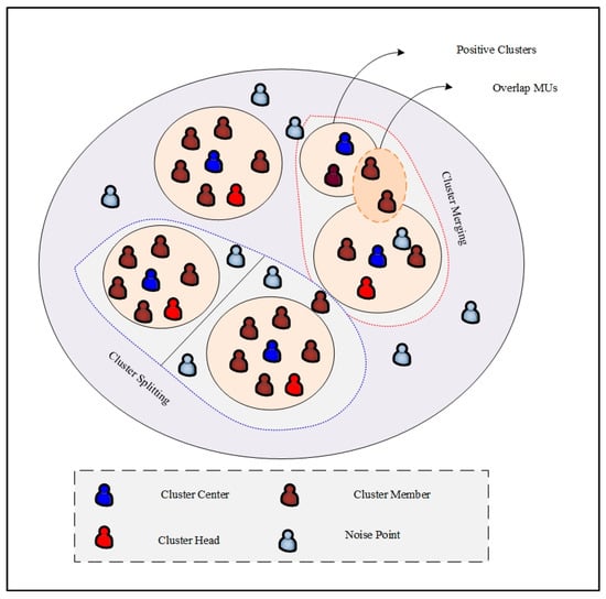 - The energy consumption is minimized, and the mobility of users is captured by clustering the MUs using the triple-mode density peak clustering (TM-DPC) algorithm. This algorithm considers several parameters, such as mobility, density, acceleration, trajectory, and speed. The algorithm also selects cluster heads (CHs) based on high stability and less mobility.