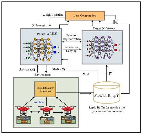 A QoS-aware deep deterministic policy gradient (DDPG)-based algorithm for latency minimization in a UAV-assisted wireless network is proposed in [34], where the authors jointly optimize resource allocation and task offloading. The authors in [35] propose a virtual cognitive resource allocation algorithm in a 5G-assisted UAV network. To assign virtual resources to MUs, resources are initially allocated based on the MU’s on-demand requests. Subsequently, resources are reallocated to the MUs to ensure QoS.