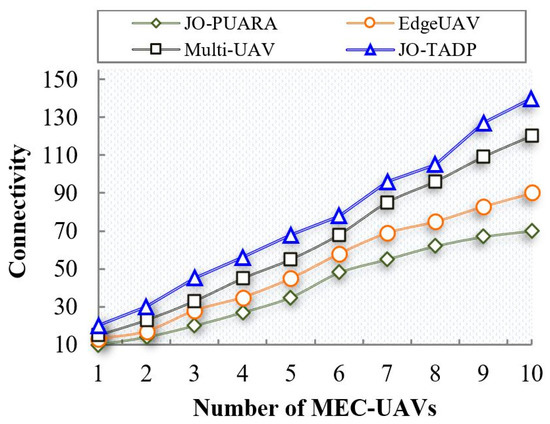 The connectivity metric is defined by the range that the MEC–UAVs provide resilient and reliable services to the underlying MUs. Figure 5 illustrates a comparison of connectivity between the proposed JO-TADP and existing works regarding MEC–UAV connectivity. When the maximum number of MEC–UAVs are placed, i.e., 10, the proposed work achieves the connectivity of 140. In contrast, the existing works such as JO-PUARA, EdgeUAVs, and Multi-UAV achieve the connectivity for the same number of MEC–UAVs 70, 90, and 120, respectively. From that, it can be noticed that the proposed work gains better connectivity than the existing works.