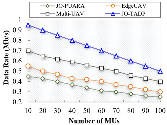 Similarly, Figure 9 provides the comparison results of data rate between the proposed JO-TADP and the existing works with respect to the number of MUs. It can be seen that when the number of MUs reaches 100, the data rates decrease to 0.5 Mb/s, whereas the existing works JO-PUARA, EdgeUAVs, and Multi-UAV achieve data rates of 0.25, 0.3, and 0.4 Mb/s, respectively, which are lower than the proposed work. The proposed work achieves higher data rates even though the number of MUs increases in the environment. The reason for such higher data rates is that the proposed scheme performs MU clustering based on MU mobility using the TM-DPC algorithm. MU Clustering reduces energy consumption, increasing data rate. Furthermore, the clusters are effectively managed through cluster merging and splitting. However, the previous studies lacked MU management, resulting in lower data rates than the proposed work.