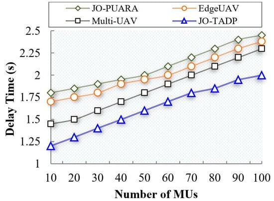 Figure 10 depicts the delay comparison between the proposed JO-TADP and the existing works in terms of the number of MUs. It can be noticed that when the number of MUs increases to 100, the delay time increases to 2 s. In contrast, the existing works JO-PUARA, Edge UAVs, and Multi-UAV achieve delays of 2.45 s, 2.38 s, and 2.3 s, respectively, higher than the proposed method.