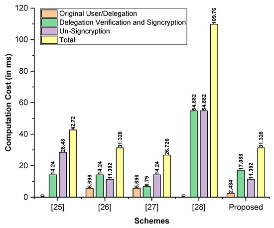 As shown in Figure 2, it was demonstrated that the proposed scheme had a lower computation cost in comparison to the extant schemes proposed by Yanfeng et al. [25], Li et al. [27], and Qu and Zeng [28]. The computation cost of the proposed scheme and that of Bhatia and Verma [18]’s scheme were identical; however, Bhatia and Verma [26]’s scheme had several serious flaws, such as requiring a secure channel for the distributions of partial private key, sending the identity in an open channel to , which can compromise the anonymity of the sender and receiver, and being susceptible if a Type 1 adversary replaced the user public key.