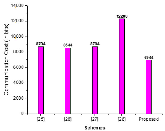 In Table 4, we compare the primary operations of communication cost for the proposed scheme and other schemes that were proposed, including those proposed by Yanfeng et al. [25], Bhatia and Verma [26], Li et al. [27], and Qu and Zeng [28]. As shown in Table 4, represents the message size, which we assume was 2048 bits, represents the parameter size, which belongs to elliptic curve and was equal to 160 bits [30,31], represents the identity size, which belongs to elliptic curve and was equal to 160 bits, and represents the parameter size, which is part of the bilinear group, and its value was 1024 bits. As detailed in Table 4 and depicted in Figure 3, the proposed scheme had lower communication costs than its counterparts.