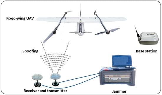 Figure 1 represents the hardware system for GPS signal spoofing detection in UAVs. The vehicle chosen for our experiments was a composite-wing UAV with a rotor and fixed wings; we chose a deceptive jammer as the instrument to spoof the GPS signal. The base station can transmit the GPS signal dataset collected by the UAV to the ground through wireless signals. The transmitter transmits the spoof signal from the jammer. The receiver receives the GPS signals in the UAV to determine the location, speed, and other information of the UAV. In the following, we elaborate on the models and specifications of the composite-wing UAV and the spoofing jammer.