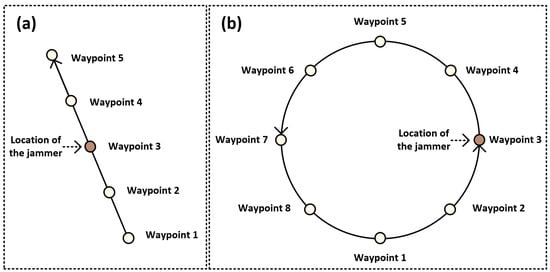 Figure 2 shows the flight path diagram of the CW-10 II UAV, and we completed four kinds of flight tasks: straight flight without deception, straight flight with deception, arc flight without deception, and arc flight with deception. As shown in Figure 2a, during the UAV straight-line flight task, our UAV took off at Waypoint 1 and started deception at Waypoint 3. The deception mode was directional, driving the UAV to the east and landing it at Waypoint 5. As shown in Figure 2b, during the UAV arc flight task, our UAV took off at Waypoint 1 and started deception at Waypoint 3. The deception mode was still directional to the east, and the UAV landed at Waypoint 1 after completing a circle of the flight task. The time and weather conditions of all the UAV flight experiments are presented in Table 3, and the flight plan is displayed in Table 4.