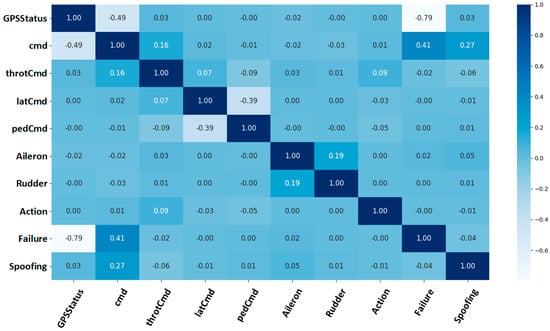 Figure 3 shows the Spearman’s rank correlation coefficients between features and spoofing. As can be seen from Figure 3, the Spearman’s rank correlation coefficients of the feature parameters such as GPSStatus (GPS status), cmd (command), throtCmd (throttle command), latCmd (rotor lateral control command), pedCmd (rotor yaw control command), aileron (aileron command), rudder, Action (control command), and failure were less than 0.2, as they have very weak or no correlation with spoofing. As a result, we eliminated the aforementioned feature quantities that exhibit very weak or no correlation with spoofing.