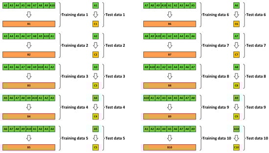 As shown in Figure 9, we first divided the GPS signal dataset, which had undergone data enhancement, into 10 mutually exclusive parts using hierarchical sampling. During each training iteration, we selected one part of the dataset as the test set and the remaining parts as the training set. We then applied the SVM-SMOTE algorithm to expand the data in the training set using both the SMOTE and SVM methods. For example, during the first training iteration, we used A1 as the test set and A2–A10 as the training set, and obtained the new test set C1 and training set B1 through data augmentation. This process was repeated for each training iteration, until the tenth iteration, where we used A10 as the test set and A1–A9 after data augmentation as the training set, and obtained the new test set C10 and training set B10 through data augmentation.