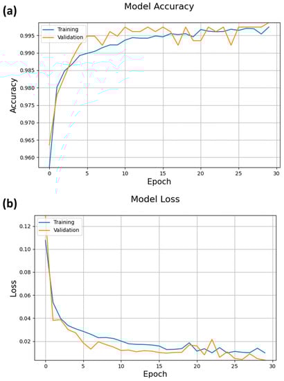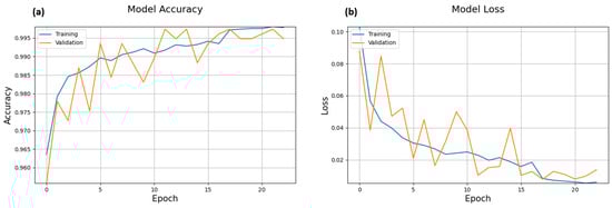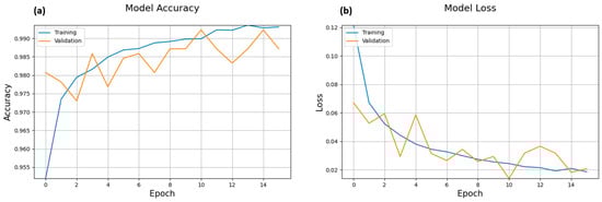 Accuracy (a) and loss functions (b) of the PCA-MLP model.