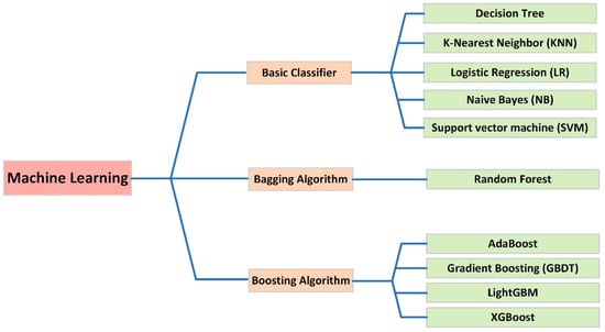 After completing data enhancement and feature selection on the GPS signal dataset, we established a GPS signal spoofing detection model based on machine learning. We selected various algorithms to establish the model, including basic classifiers, such as decision trees, the K-nearest neighbor (KNN), logistic regression (LR), naive Bayes (NB), and SVM algorithms, bagging algorithms (using the random forest (RF) integrated learning algorithm), boosting algorithms (including the AdaBoost algorithm, Gradient Boosting (GBDT) algorithm, LightGBM algorithm, and XGBoost algorithm), and neural networks. Figure 11 shows the machine learning model of GPS signal spoofing detection.