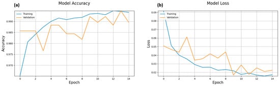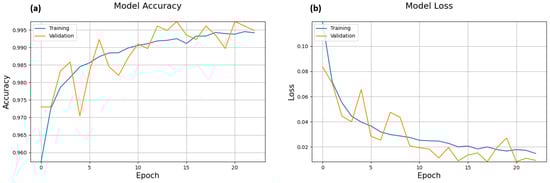 Accuracy (a) and loss functions (b) of the PCA-GRU model.