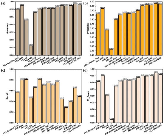 Accuracy (a), Precision (b), Recall (c) and F1_Score (d) of 15 models on GPS signal spoofing dataset.