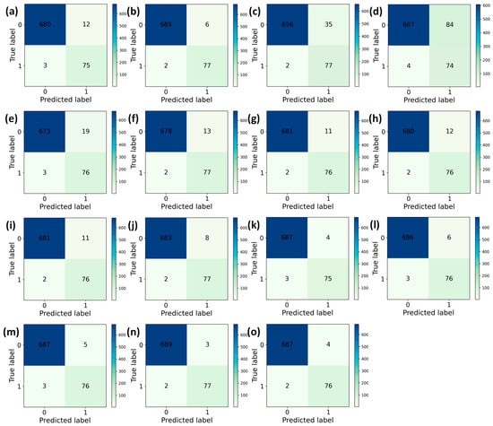 Confusion matrix of 15 spoofing models on GPS signal dataset. (a) PCA-Decision Tree; (b) PCA-KNN; (c) PCA-LR; (d) PCA-NB; (e) PCA-SVM; (f) PCA-Random Forest; (g) PCA-AdaBoost; (h) PCA-GBDT; (i) PCA-LightGBM; (j) PCA-XGBoost; (k) PCA-MLP; (l) PCA-LSTM; (m) PCA-GRU; (n) PCA-CNN-LSTM; (o) PCA-CNN-GRU.