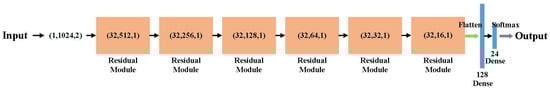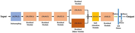 With extracted local and global information, the addition of two branches facilitates the subsequent self-attention task. The self-attention mechanism has a strong capability to extract interesting information, which will affect the results of category classification. The traditional fully connected layer generally has more parameters than the convolution layer and benefits convergence. We put the fully connected layer at the two last layers to obtain the features of the signal, and a softmax function distributes the probabilities of each category. The number of dense units should match the number of modulation schemes used. By utilizing subsampled inputs, we can significantly reduce the number of trainable parameters in the last two layers of our model, which tend to be the main source of computational cost. Figure 2 shows the main framework of our model with a subsampling rate of 4. Figure 3 depicts the primary architecture of ResNet as presented in []. Our method employs fewer kernels in each convolutional layer compared to ResNet. Additionally, the input size of the first fully connected layer in ResNet is , while our model’s input size is . Consequently, the number of trainable parameters in our approach has been reduced by a factor of four.