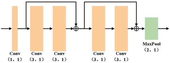 Structure of the residual module. Each block has two convolution layers with a kernel size of and one max-pooling layer with a kernel size of ; however, the sizes of these layers are and , respectively, when in the first residual module of the MSSA.