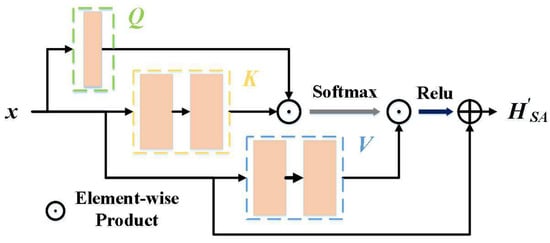After the two branches of convolution and dilated convolution, a module that can integrate global and local information to extract interesting features is needed. Therefore, a self-attention module is introduced. The attention model can filter ineffective information [], which can be noise generated in the transmission process or information repeated in a periodic signal. The output of attention module can be formulated as: