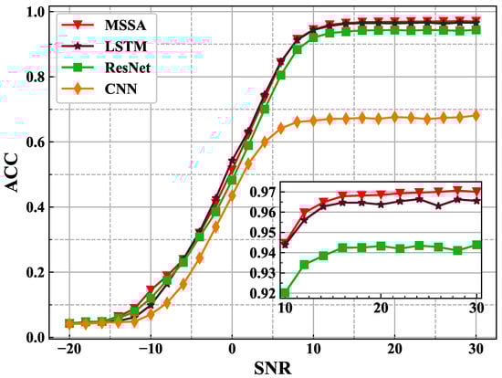 LSTM had the best performance when tested on the RML 2018.01a dataset and was the main comparison network []. In addition, MSSA is an improvement network based on ResNet, and a CNN is the baseline of the AMR task. It is necessary to compare MSSA with CNN and ResNet.