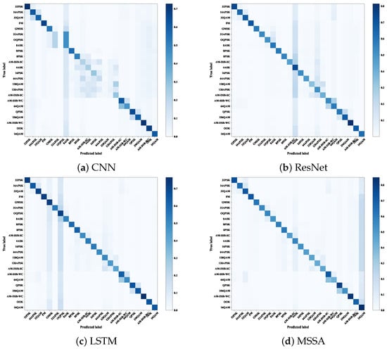 The other evaluation index of AMR is the confidence confusion matrix of models, which will reflect the quality and performance of the classifier. It demonstrates the certainty and correctness of the classifier’s classification results for each category during the prediction phase. By observing the confidence confusion matrix, we can identify which categories have more accurate classification results, which categories are often confused, and the performance of the classifier when classifying samples with high uncertainty. We tested samples with different SNRs and calculated the mean confidence indexes of each class when inputting a signal. Then, confusion results are visualized in Figure 9. The vertical axis on each matrix denotes the true labels, and the horizontal axis denotes the predicted labels. As shown in Figure 8, MSSA performed the best in the confidence confusion matrix. MSSA had one modulation scheme, 16QAM, which was difficult to recognize, while LSTM and ResNet had two modulation schemes.