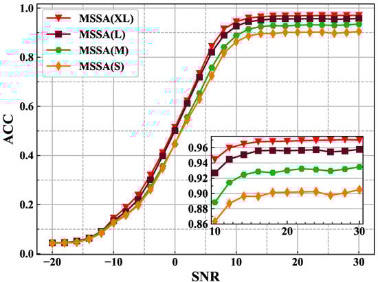 This paper adjusted the structure of the model with a subsampling rate of 4, as shown in Table 1, because the length of the data is too short to achieve a higher mean classification accuracy when trained on the original model. The accuracy values of models are shown in Table 4, where the indicator values are shown for the convenient comparison of the training speed, parameters, and classification recognition accuracy. The number of trainable parameters in a model is strongly correlated with the utilization of computational and memory resources. Increasing the number of parameters may lead to a higher computational load on the terminal or embedded microprocessor, thus reducing both the training and inference speeds. MSSA(L) and MSSA(S) had the fastest speeds. MSSA(S) used the fewest parameters, while the accuracy of MSSA(L) was higher. While MSSA(L) had more parameters, it had the same training speed as ResNet and higher accuracy. Figure 10 shows the accuracy curves of models in each SNR.