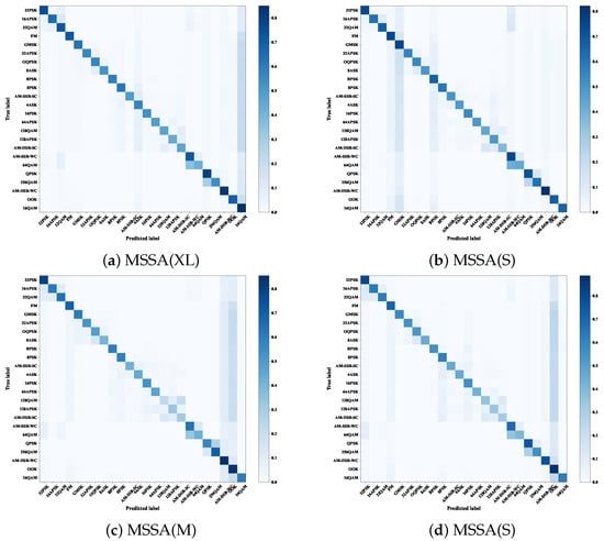 The capabilities of models decreased as the number of parameters decreased, but the speeds increased. These models with different sizes all outperformed the CNN, and even at the same training speed, MSSA(L) was better than ResNet. These four MSSAs in different sizes could be applied to different situations with different requirements, such as lower parameters or faster speeds. Figure 11 shows the confusion matrices. The OOK modulation scheme was difficult for MSSA in the M or S size. Although they have a problem recognizing signals with OOK modulation, the confidence indexes of the OOK scheme are high (above ).