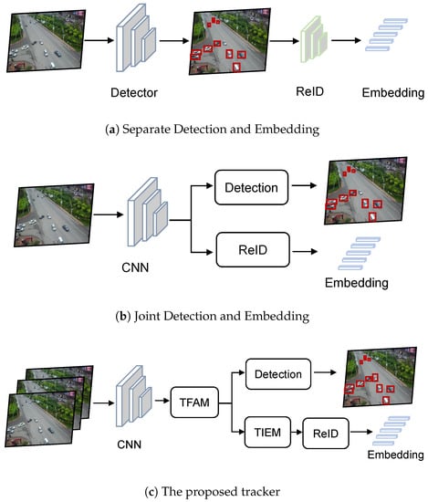 Comparison between (a) the separate detection and embedding method, (b) the joint detection and embedding method, and (c) the proposed tracker. The TFAM module aggregates multi-frame features, and TIEM establishes topological relationships between the object and other objects as well as the environment.