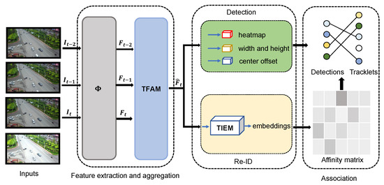 Given a video sequence obtained by a moving UAV, we aim to give the categories, bounding boxes, and object identities for all objects of interest. Figure 2 shows the overall pipeline of the proposed method. Our approach consists of five main components, namely, generic feature extraction, multi-frame feature aggregation, detection, object embedding enhancement, and association. At first, the backbone (DLA-34 [49]) extracts the feature map of each frame, where and . Our main contributions lie in the proposal of the temporal feature aggregation module (TFAM) and the topology-integrated embedding module (TIEM). In the association stage, we utilize the Hungarian [50] matching algorithm to allocate the detected objects to the corresponding trajectories based on the acquired detection results and object embedding features.