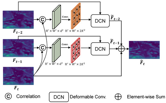 The above operation will cover a spatial area of centered on . The larger the d, the larger the range of position offsets that can be handled. The output of the correlation is in four dimensions, where each pair of 2D positions produces a corresponding correlation value. In practice, we reshape the relative displacements in channels and obtain . Then, the spatial offset is calculated by three convolutional layers, where K is the size of the DCN convolutional kernel. Then, given the spatial offset and a previous feature map, the propagated feature is obtained via a DCN as