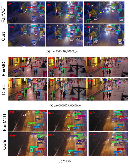 In this section, we first give the visualization results of the proposed method and analyze its robustness. We compare the proposed method with the baseline method FairMOT in Figure 5. As shown in Figure 5a,b, FairMOT failed to detect and track a large number of objects in the areas marked by red dashed boxes, while our proposed method successfully located and tracked these objects in these challenging low-light scenes, which we attribute to the proposed multi-frame feature fusion module and target embedding feature enhancement module. This validates the idea that multi-frame features can provide more temporal contextual cues and that the spatial–topological relationships can improve the discriminative power of object feature embeddings. In addition to showing two random cases in the VisDrone2019 dataset, we also present another case in the UAVDT dataset in Figure 5c. Overall, our experimental results demonstrate the superiority and effectiveness of our proposed method compared to FairMOT.