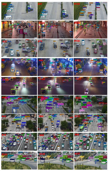To verify the effectiveness of the proposed method, research experiments were conducted on two existing UAV video multi-object tracking datasets, namely VisDrone2019 [11] and UAVDT [12]. VisDrone2019 contains 56 training video sequences, 7 validation sequences, and 17 test-dev sequences. The videos includes a diverse range of scenarios, including sports fields, commercial streets, highways, and suburbs. In evaluating the multi-object tracking task, five categories of objects were considered: cars, buses, trucks, pedestrians, and vans. In contrast, only a single category of objects, cars, is tracked in the UAVDT dataset. This dataset consists of 50 videos (30 for training and 20 for testing), mainly taken in plazas, intersections, and highways under different lighting conditions (e.g., day, night, fog, etc.). Videos captured by UAVs face more complex challenges than other multi-object tracking benchmarks [2,3]. These challenges include a higher proportion of small objects (whose pixel values are less than 32 × 32) and motion blur caused by the motion overlap between the UAV and the objects. These challenges may cause object tracking to fail.